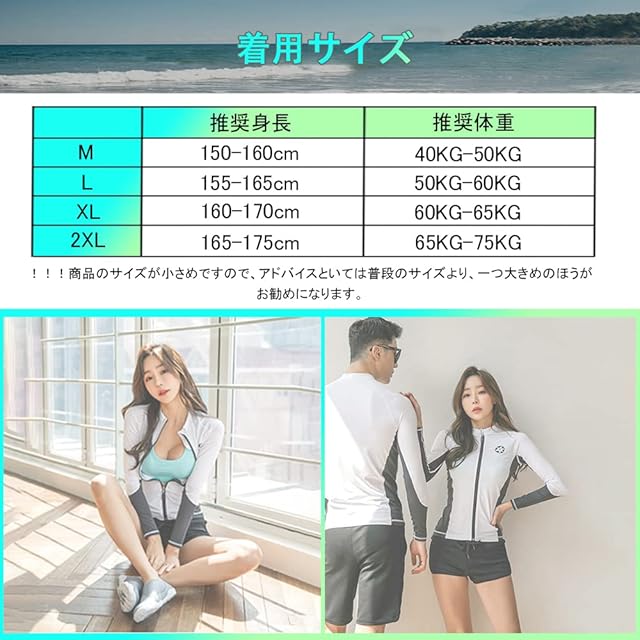 !!!商品のサイズが小さめですので、アドバイスといては普段のサイズより、一つ大きめのほうがお勧めになります。【セット内容&着用サイズ】長袖ラッシュガード、ショートパンツ、ブラ、レギンス、ビギニショーツがセットになっています。必要なものがセットになっているので、届いてすぐに海に行くことができます。長袖ラッシュガードとレギンスセット、レギンス付き足首まであるので、虫刺されやクラゲ対策、擦り傷などの外傷対策にも。【着用サイズ】【M: 推奨身長150-160cm/推奨体重:40KG-50KG】【L:推奨身長155-165cm/推奨体重:50KG-60KG】【XL:推奨身長160-170cm/推奨体重:60KG-65KG】【2XL:推奨身長165-175cm/推奨体重:65KG-75KG】※サイズを選択する時サイズ表を参照してください。