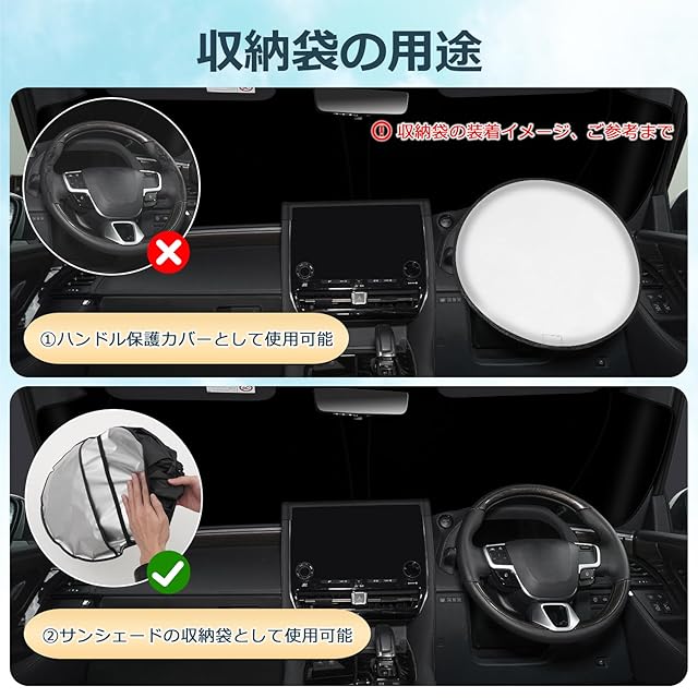 3.【多機能】:アルミ遮熱シートの眩しい光線を抑えることができます。他人に迷惑を掛けないし、プライバシーも保護できます。また、夏の日は熱線を遮断し、車内温度を抑えて、冬の日は車内の熱を外から逃がさない為、暖房効果があります。【ストラップ&収納袋付き】:本製品はストラップを設計し、収納する場合、ストラップで収納できます。また、収納袋も改良され、ハンドルカバーに置く可能です。