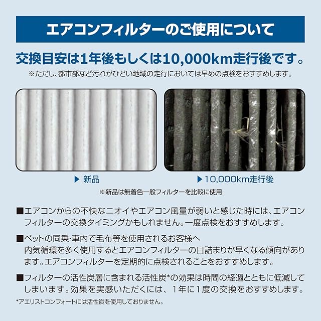 [交換目安] 1年もしくは10,000km走行後 (目に見えないチリやホコリの蓄積により、本来の性能が発揮できなくなる目安)
