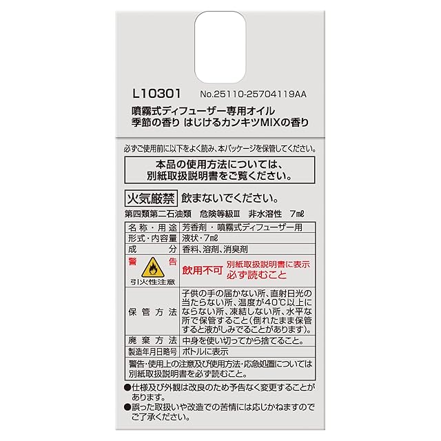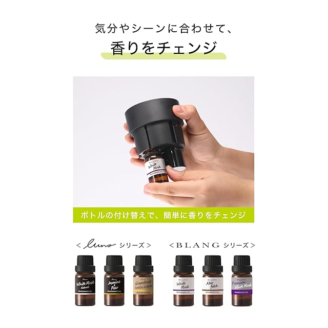 噴霧口に詰まらず、オイルが無くなるまで気化して均一に香るように処方されています。※専用オイル以外は最後まで気化することができず、水滴のまま噴き出すおそれがあります