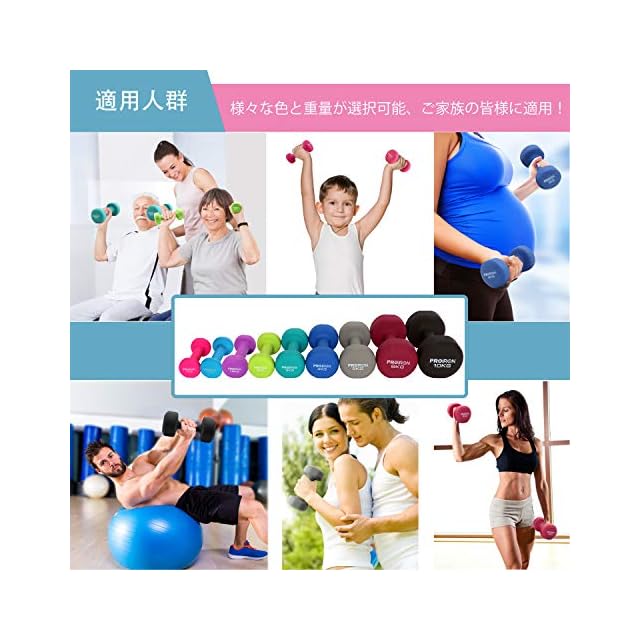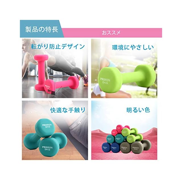 PROIRON ネオプレン コーティング ダンベル カラー ダイエット 筋トレ トレニンぐ ホームジム ノンスリップ 片手1kg/1.5kg/2kg/3kg/4kg/5kg/6kg/8kg/10kg 2個セット * 銑鉄の中身がネオプレンコーティングで包まれています。 * 握りやすくて汗をかいても滑られません。 * 両側のボトムはストレートで転がりにくい。(アンチ・ローリングなデザインは置きやすい) * 材料の選ぶのが厳しいと材質のいい利点を持っています。鉛とフタル酸(フタル酸エステル)がありません。 * 鮮やかなロゴタイプと重量の表記は簡単に見えます。