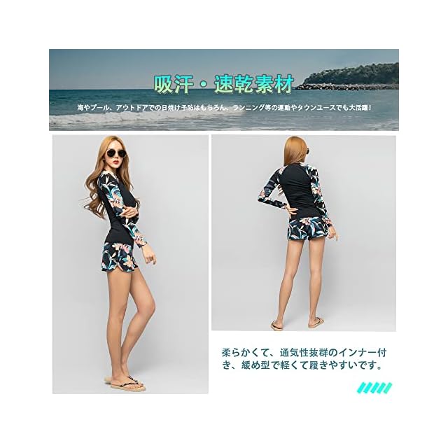 <b>【セット内容】</b><br/> 長袖ラッシュガード、ショートパンツ、ブラ、レギンス、ビギニショーツがセットになっています。長袖ラッシュガードとレギンスセット、レギンス付き足首まであるので、虫刺されやクラゲ対策、擦り傷などの外傷対策にも。<br/><br/> <b>【吸汗速乾】</b><br/> 速乾性に優れた水着素材なので、海やプールだけでなくジムやヨガなど 、汗をかくシーンでの使用もOK、水陸両用で全アイテム着たまま水に入れます。軽量なのでとても動きやすく、最適の機能性、吸汗速乾通気のドライ繊維、激しい運動の後もさらっとした着心地!<br/><br/> <b>【UVカット】</b><br/> 安心のUV対策生地を使用しているため(肌に有害な紫外線を98%以上カット)、日差しが強い時の日焼け防止にも大活躍。もちろん紫外線対策もばっちりでお肌を守ります、防菌防臭。<br/><br/> <b>【優れたデザイン】</b><br/> お洒落な柄プリントすっきりしたシンプルなデザイン、機能性だけでなくデザインも考え抜かれた商品です。襟元、手首、足首にスキンケアデザインを使って、運動の快適性をします。<br/><br/> <b>【適用場合】</b><br/> 夏場のウォータースポーツや野外活動の際、海、ジム、プールやビーチ、、温泉と幅広いジャンルで使える便利なスポーツ・アイテムです。通勤、通学、ランニング、ヨガなど、スポーツウェアとしてもご利用いただけます。