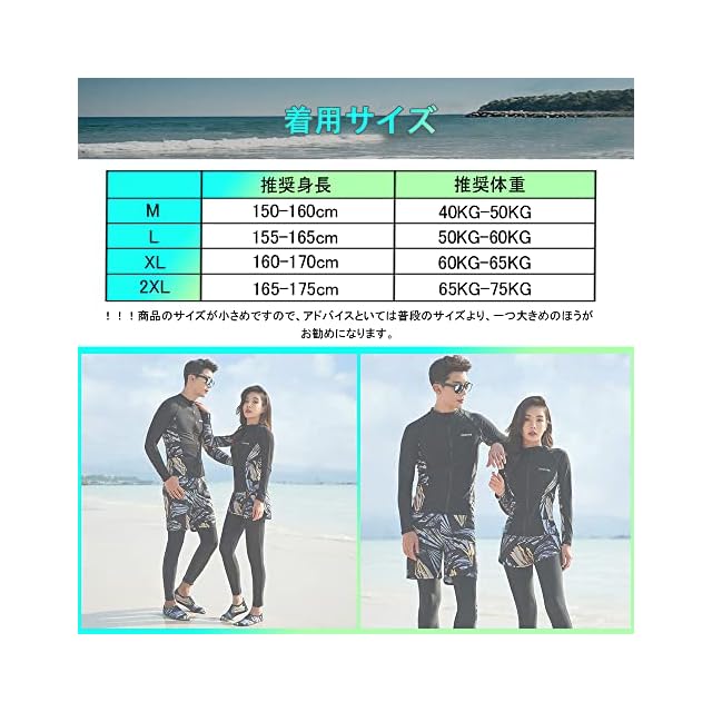 !!!商品のサイズが小さめですので、アドバイスといては普段のサイズより、一つ大きめのほうがお勧めになります。【セット内容&着用サイズ】長袖ラッシュガード、ショートパンツ、ブラ、レギンス、ビギニショーツがセットになっています。必要なものがセットになっているので、届いてすぐに海に行くことができます。長袖ラッシュガードとレギンスセット、レギンス付き足首まであるので、虫刺されやクラゲ対策、擦り傷などの外傷対策にも。【着用サイズ】【M: 推奨身長150-160cm/推奨体重:40KG-50KG】【L:推奨身長155-165cm/推奨体重:50KG-60KG】【XL:推奨身長160-170cm/推奨体重:60KG-65KG】【2XL:推奨身長165-175cm/推奨体重:65KG-75KG】※サイズを選択する時サイズ表を参照してください。