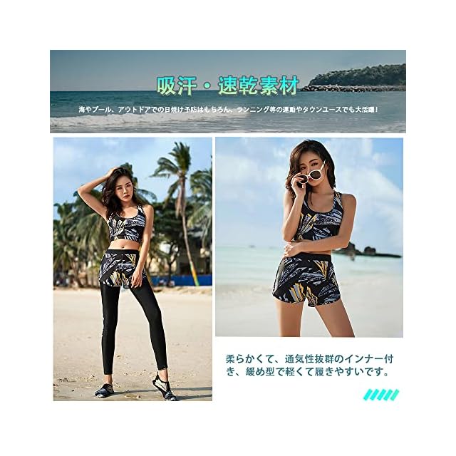 【素材構成&吸汗速乾】85%ポリエステル、15%スパンデックス。ソフトな肌触りの冷感素材を使用、良い着心地と抜群の耐久性。伸縮性に優れており、体形に合わせやすく、水中での動きも妨げないように体にフィットします。速乾性に優れた水着素材なので、海やプールだけでなくジムやヨガなど 、汗をかくシーンでの使用もOK、水陸両用で全アイテム着たまま水に入れます。軽量なのでとても動きやすく、最適の機能性、吸汗速乾通気のドライ繊維、激しい運動の後もさらっとした着心地!