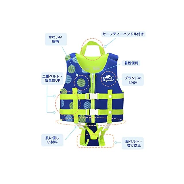 <p>Gogokidsは、お子様の体を守るために、肌に優しい素材を使用しています。 安全性確保の上に、フィット感とおしゃれなデザインも兼ね揃えています。 お子様に楽しい水遊びをさせてあげましょう。</p><p><br></p><p></p><p><b>商品詳細</b></p><p>素材:ポリエステル+EPEフォーム</p><p>商品サイズ:</p><p>S:90-110cm 11-18kg</p><p>M:111-125cm 18-25kg</p><p>L:126-135cm 25-35kg</p><p>カラー:ピンク、ブルー</p><p>メーカー:ご購入からの90日間以内、製品自体の欠陥による故障が発生した場合、無償で交換いたします。</p><p><br></p><p></p><p><b>ご注意:</b></p><p>※汚れたら水で洗い、風通しの良い場所で乾燥させてください。</p><p>※水や日光、熱から保護するため、専用の袋に保管してください。</p><p>※CE認証済みですが、運輸省の形式承認を受けた救命胴衣ではありませんので、小型船舶の備品としては認められません。</p>