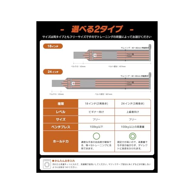 【 全てのトレーニーに満足して頂けるように2サイズを用意】 【18インチ・46cm】【24インチ・61cm】丸洗いも出来ます!強化マジックテープを使用しているのでトレーニング中に外れることもなく、しっかり固定できます。