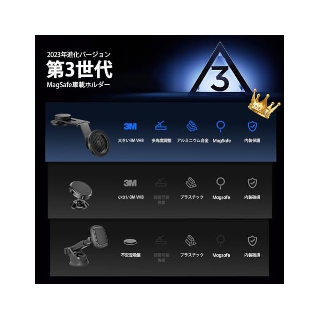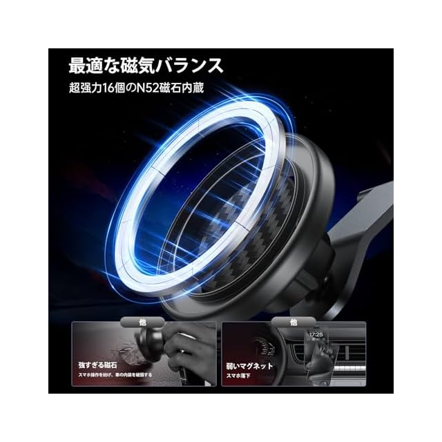 超強力磁力:業界最強N55磁石を16個搭載し、MagSafe対応スマホをガッチリと固定。N55磁石は一般的なN48磁石と比較して非常に強力な磁力を持っているため、悪路でガタガタ揺れる車内でもスマホが落ちにくくなります。MagSafe対応iPhoneに内蔵されているマグネットと同じ形状でマグネットを配置しているので、端末をピッタリ保持することが可能です。