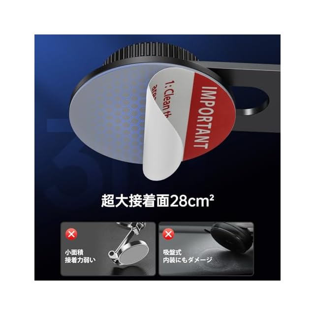 3M製強力両面テープ搭載:車載ホルダーの底部は高品質の3M両面テープを使用し、円形の6cm テープで、粘着面積が大きくなり、粘着の効果をできます。極寒でも夏場の暑い車内でも、粘着の効果が非常に安定しています。