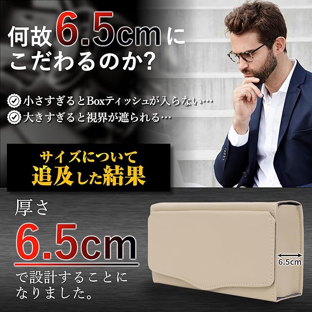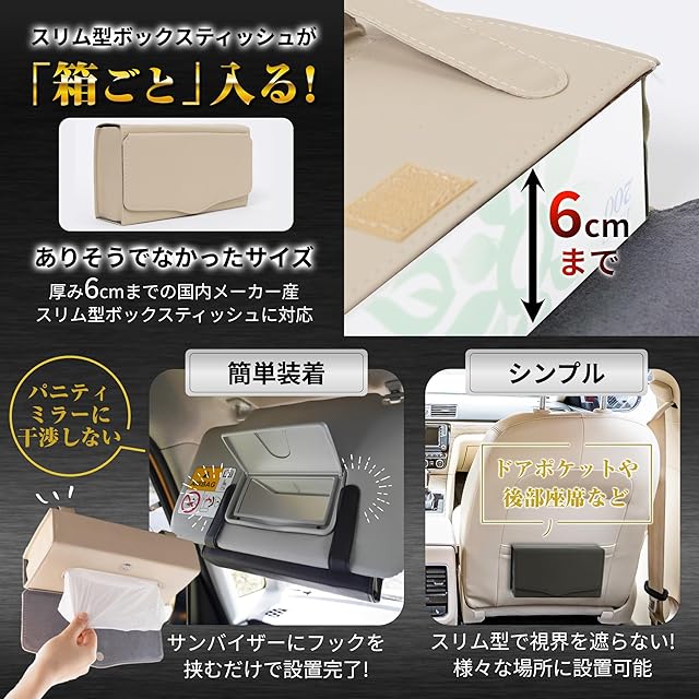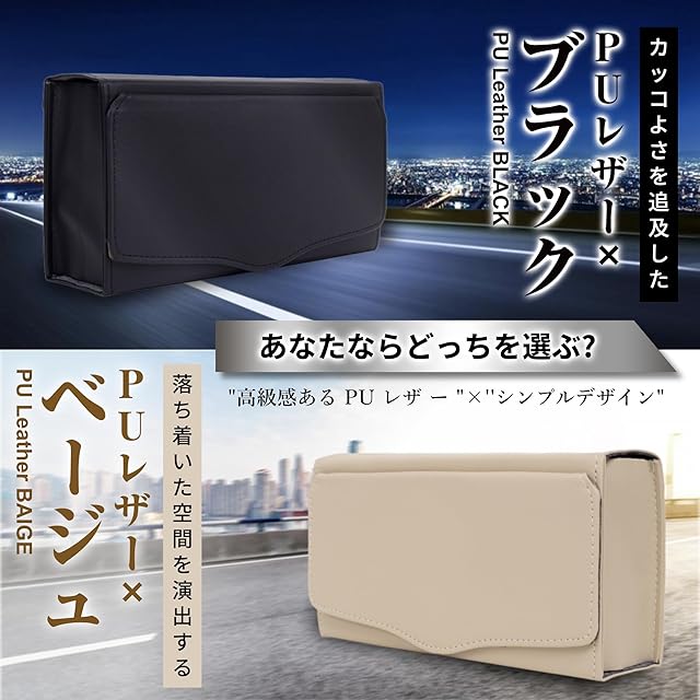 様々な方の貴重なご意見から完成した当社オリジナルサイズで、国内の有名メーカーのスリムタイプのボックスティッシュが箱ごとスッポリ入ります。 車内の景観を損なわない高級感あるPUレザー素材でお洒落にティッシュ箱を収納できとても便利です。 商品サイズ:24.5cm×12.5cm×6.5cm 重量190g IROKOHA 商願2021-139828