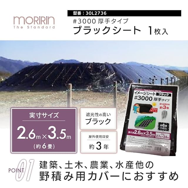 商品名:モリリン ブラックシート レジャーシート #3000 実寸約2.6m×3.5m 約6畳 厚手 屋外使用目安約3年 ハトメ数14 雨よけ 風よけ 野積み 30L2736