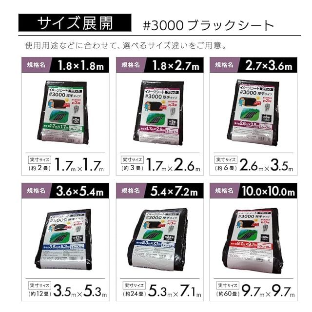 【仕様】本体サイズ:2.7×3.6m(呼称)、実寸サイズ:2.6m×3.5m(約6畳)/材質:ポリエチレン(本体)、アルミニウム(ハトメ)/ハトメ数:14ヵ所/ハトメ間隔:約90㎝/屋内仕様目安:約3年/カラー:ブラック