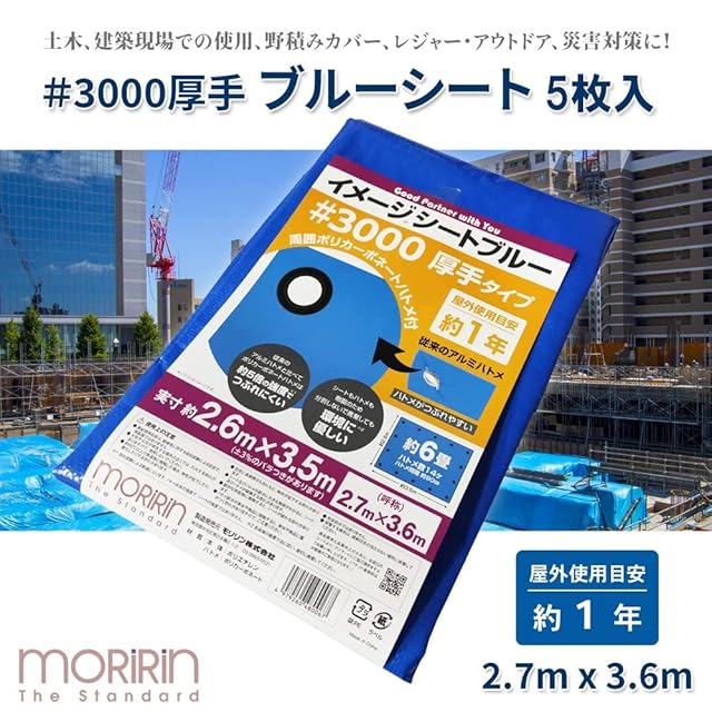 商品名:モリリン ブルーシート レジャーシート 5枚セット イメージシートブルー #3000 厚手 2.7×3.6m ポリカーボネートハトメ 使用目安約1年