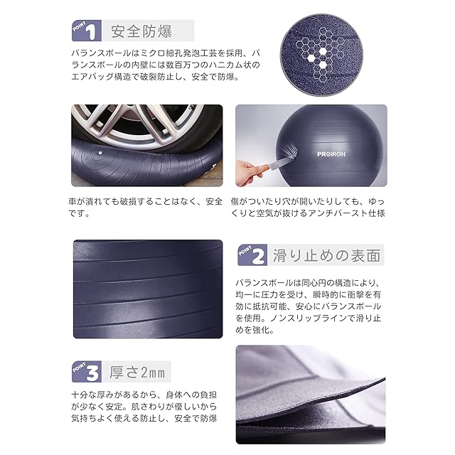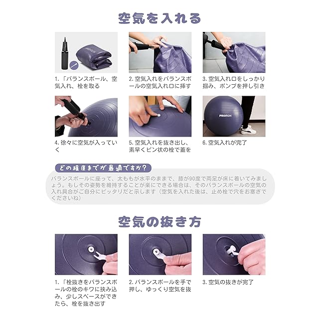 【高品質で耐久性のある素材】 PROIRONのバランスボールは、高品質な2mm厚のPVCで作られ、耐久性と快適性を兼ね備えています。6色のスタイリッシュなカラーから選ぶことができます。また、使用しやすいハンドポンプも同梱されています。空気充填方法や選択肢については、写真をご参照ください。