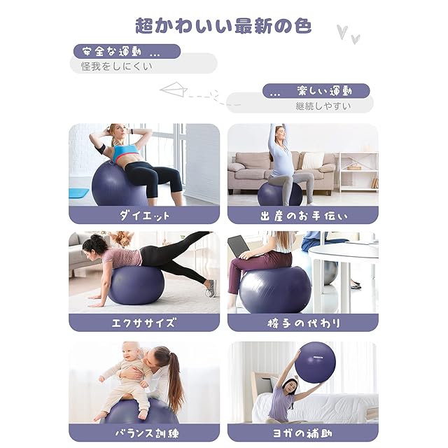 【多目的利用】 バランスボールは、楽しみながらエクササイズできる道具として人気があります。オフィスチェアとして姿勢改善に、ヨガやピラティスのトレーニングボールとしても活用できます。また、リハビリや回復、産後ケアにも役立ち、ストレス軽減や心身の健康促進に寄与します。