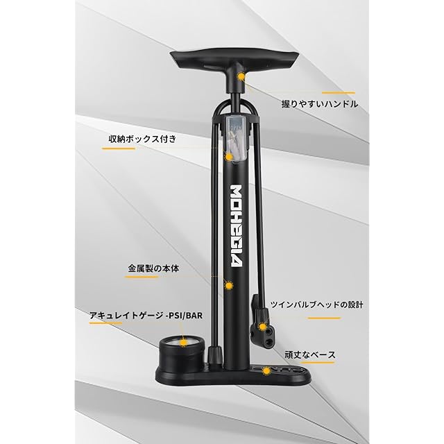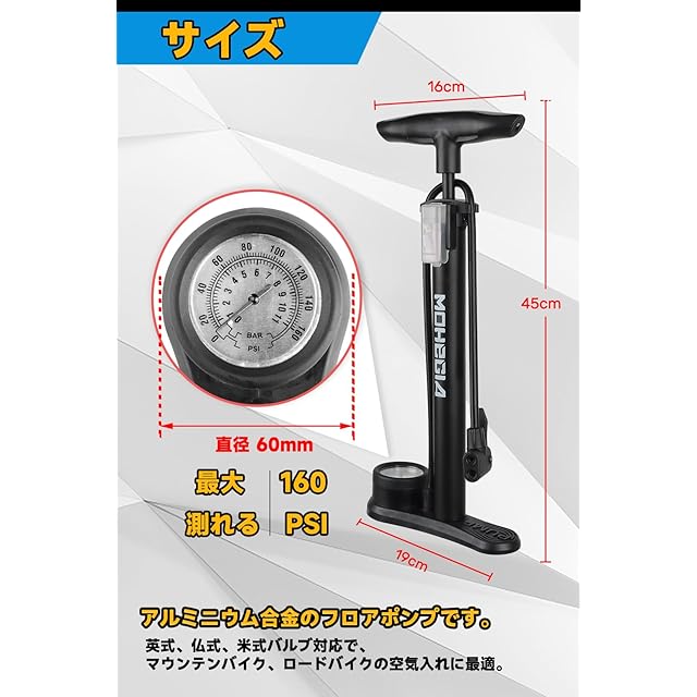 商品名:MOHEGIA 自転車 空気入れ: フロアポンプ - 仏式 米式 英式バルブ対応 - 160PSI スケール圧力計 - ブラック
