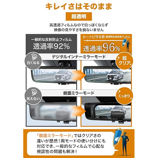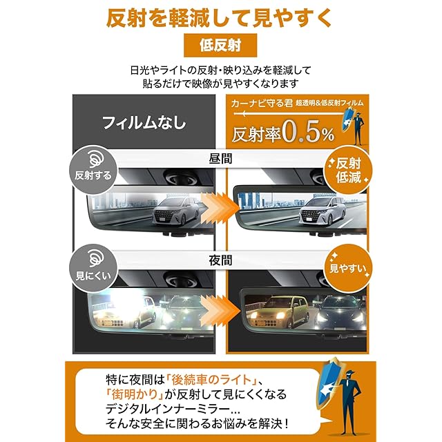 【低反射】反射率0.5%の低反射フィルムなので、反射や映り込みを軽減し、明るい車内でも映像が見やすくなります。特に夜間は「後続車のライト」、「街明かり」が反射して見にくくなるデジタルインナーミラー...そんな安全に関わるお悩みを解決します。 【超透明】:透過率96%の高透過フィルムなので、一般的な反射防止フィルムのように白っぽくならず、映像の見やすさを損ないません。「鏡面ミラーモード」との両モードの使い分けにも対応でき、視認性の心配もありません。