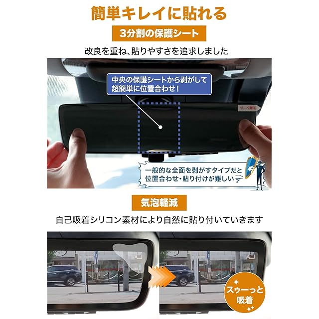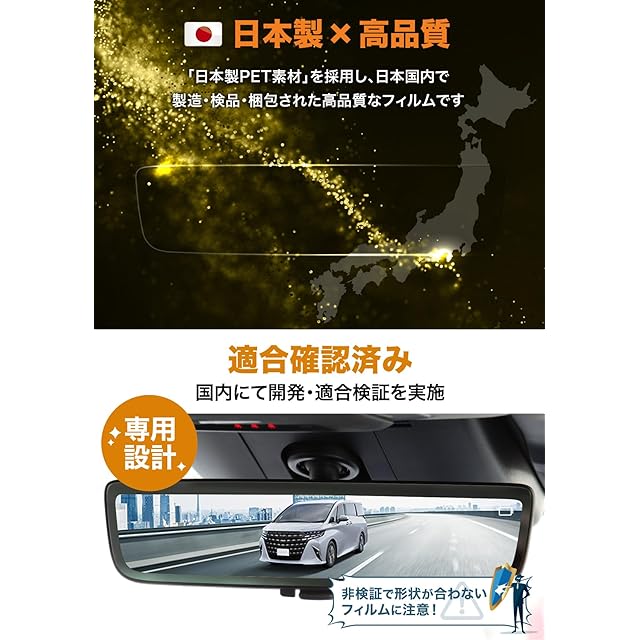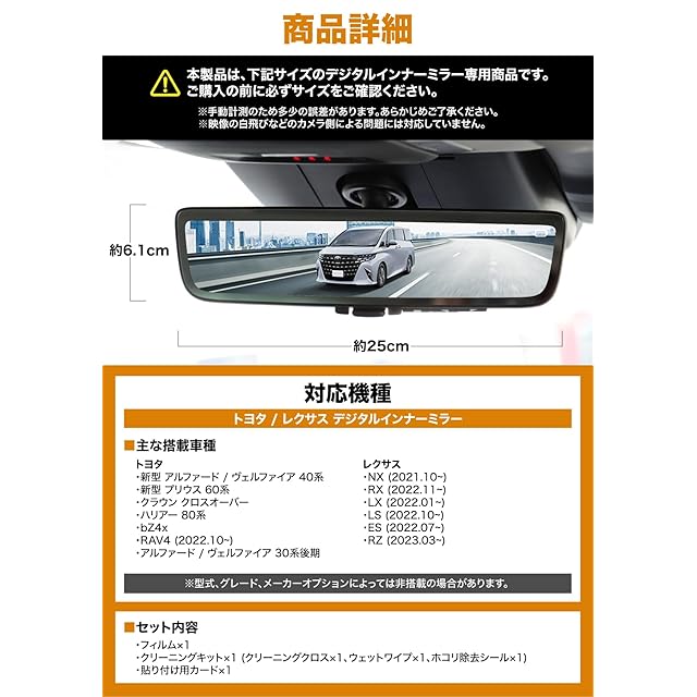 ※貼り付け後フィルムに分割線が見られる場合は、強く押してしっかり吸着させると消えます。 【対応機種】:トヨタ / レクサス デジタルインナーミラー 専用 【対応機種】: 新型 アルファード / ヴェルファイア 40系 / 新型 プリウス 60系 / クラウン クロスオーバー / ハリアー 80系 / bZ4x / RAV4 (2022.10~) / アルファード 30系後期 / ヴェルファイア 30系後期 / NX (2021.10~) / RX (2022.11~) / LX (2022.01~) / LS (2022.10~) / ES (2022.07~) / RZ (2023.03~)