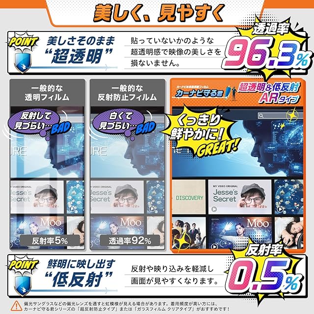 【超透明】:透過率96%の高透過フィルムなので、画面の美しさを損わず、鮮やかな画面のまま映像を楽しめます。 【低反射】反射率1.1%の低反射フィルムなので、反射や映り込みを軽減し、明るい車内でも画面が見やすくなります。 【指紋防止】:フィルム表面の特殊フッ素加工により、指紋が目立ちにくく、付着しても簡単に拭き取れます。