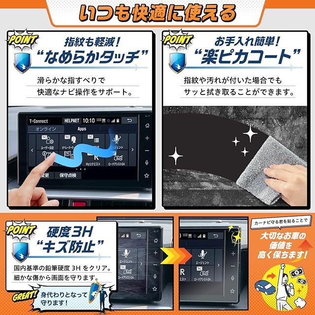 【スムースタッチ加工】:特殊コートにより、地図の操作でも指のひっかかりが少なく、ナビ操作を快適にします。 【傷つき防止】:国内基準の鉛筆硬度3Hをクリアしたフィルムで、引っかき傷などの細かな傷から画面を守ります。 【気泡防止】:弊社独自のシリコン吸着素材により、気泡は指やカードで簡単に押し出すことができます。貼り付けを失敗した場合でも貼り直しが可能です。