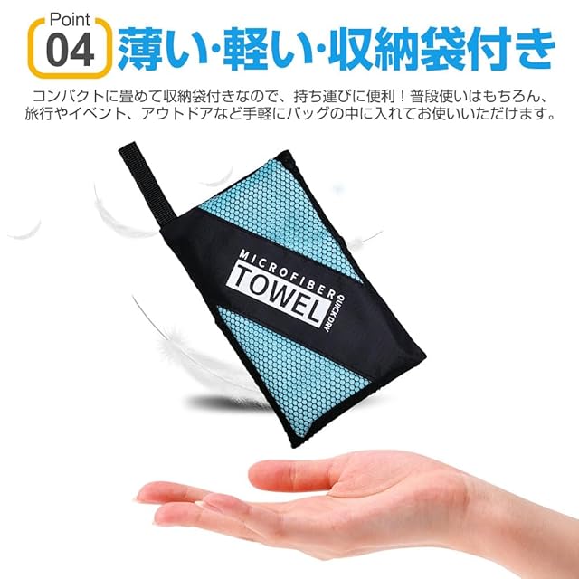 【コンパクトで軽量】薄い生地なので、折り畳み易く、簡単に収納袋に収まる。折り畳み時は、薄さは普通の綿タオルの1/4コンパクトなタオル。速乾タオルサイズ:40cm×80cm 付属品:収納袋