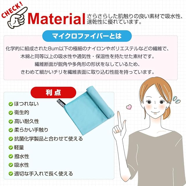 【超吸水・速乾・抗菌】見た目が薄くても吸水性に優れ、タオル専用のふわふわなマイクロファイバー繊維を使った吸水速乾タオル。極細繊維で肌触りもシルキーです。抜群の吸収力のうえ、軽くて肌触りも良く、耐久性も優れています。カビを防ぎ抗菌処理を施しました、汗を吸っても安心、濡らしたタオルに雑菌が繁殖するのも防いでくれます。