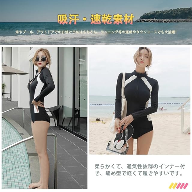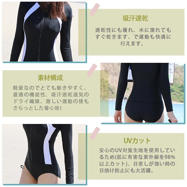 【適用場合&水陸両用】海辺のみならず、軽量なのに伸縮性抜群の生地でとても動きやすく、吸汗・速乾素材なので運動に最適です!夏場のウォータースポーツや野外活動の際、海、ジム、プールやビーチ、、温泉と幅広いジャンルで使える便利なスポーツ・アイテムです。通勤、通学、ランニング、ヨガなど、スポーツウェアとしてもご利用いただけます。水に濡れても快適に活動できる生地を使用。前開き対応のラッシュガードは着脱も簡単です、着替えに便利。