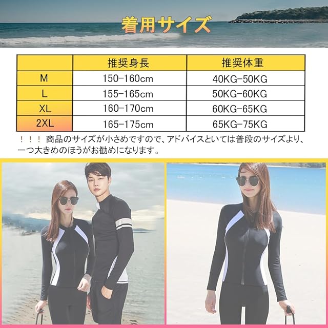 !!!商品のサイズが小さめですので、アドバイスといては普段のサイズより、一つ大きめのほうがお勧めになります。【セット内容&着用サイズ】長袖ラッシュガード、ショートパンツ、ブラ、レギンス、ビギニショーツがセットになっています。必要なものがセットになっているので、届いてすぐに海に行くことができます。長袖ラッシュガードとレギンスセット、レギンス付き足首まであるので、虫刺されやクラゲ対策、擦り傷などの外傷対策にも。【着用サイズ】【M: 推奨身長150-160cm/推奨体重:40KG-50KG】【L:推奨身長155-165cm/推奨体重:50KG-60KG】【XL:推奨身長160-170cm/推奨体重:60KG-65KG】【2XL:推奨身長165-175cm/推奨体重:65KG-75KG】※サイズを選択する時サイズ表を参照してください。
