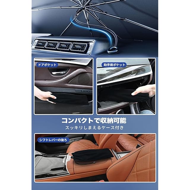 【傘型デザイン・簡単な取り付け】 傘型デザインを採用し、使用時事前に設置する必要はなく、開くだけで利用でき、不要時には傘をしまって収納バッグに入れ、場所を取らないです。設置する手間を節約できて、収納にも便利です。傘の様にコンパクトで、持ち運びも楽々。使用時サンシェードをフロントガラスにつけ、ミラー露出部のマジックテープを調節し、サンバイザーで固定するだけで設置完了ですので、女性の方でも簡単に設置できます。