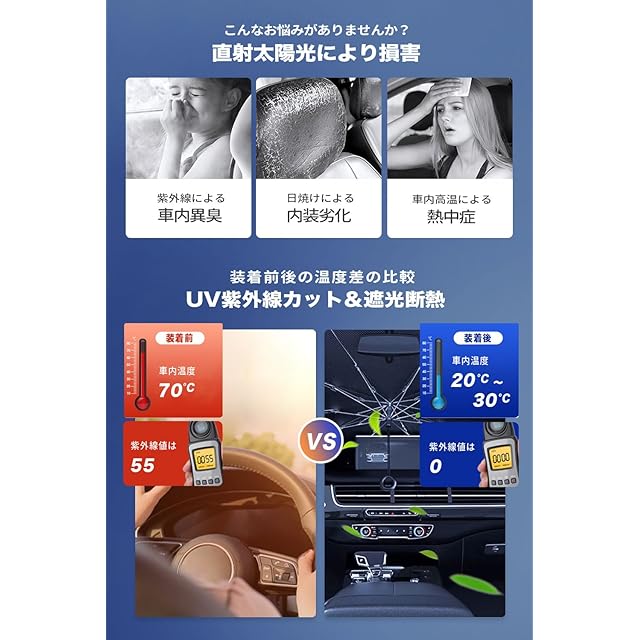 【猛暑対策99.5%以上UVカット・遮光断熱】夏には、紫外線を防ぎ、車内の温度を下げることを目指します。フロントサンシェードにより、紫外線に対するバリアを作ります。約98%以上の紫外線を効果的に遮断しますので、外気温が上昇しても、駐車中の車内を涼しく保ち、ひどい暑さを防げます。蒸し暑い車の環境に悩まされることはなくなります。内装劣化防止、ダメージや経年劣化を防ぎます。駐車時の大事な車を太陽光による損傷やハンドル焼け、ダッシュボードなどの樹脂部分の日焼けからしっかりご愛車を守ります。駐車の度に気持ちをより涼しくしてくれます。