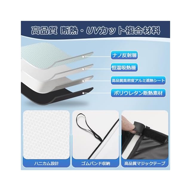 2.【ハニカム設計&高品質多層構造】:表面はハニカム設計で美的感覚とデザイン性が備えているだけでなく、見た目や質感もこだわり。生地は4層断熱、断熱保護を提供し、遮光効果が向上し、耐用年数を延ばす。1層目:ナノ反射層 、2層目:恒温吸熱層、 3層目:高品質高密度アルミ遮熱シート、4層目:ポリウレタン断熱素材。従来品よりも高い断熱効果あり、車内の温度上昇を抑制し、エアコンの効率を高めて省エネになる。