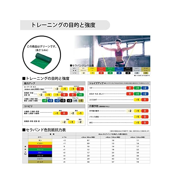 商品名:セラバンド トレーニングバンド ゴムバンド 緑 長さ 2m 幅 12.5cm 強度レベル+1 TBB-3 強度 マニュアル 野球 インナーマッスル トレーニング 筋トレ エクササイズ リハビリ