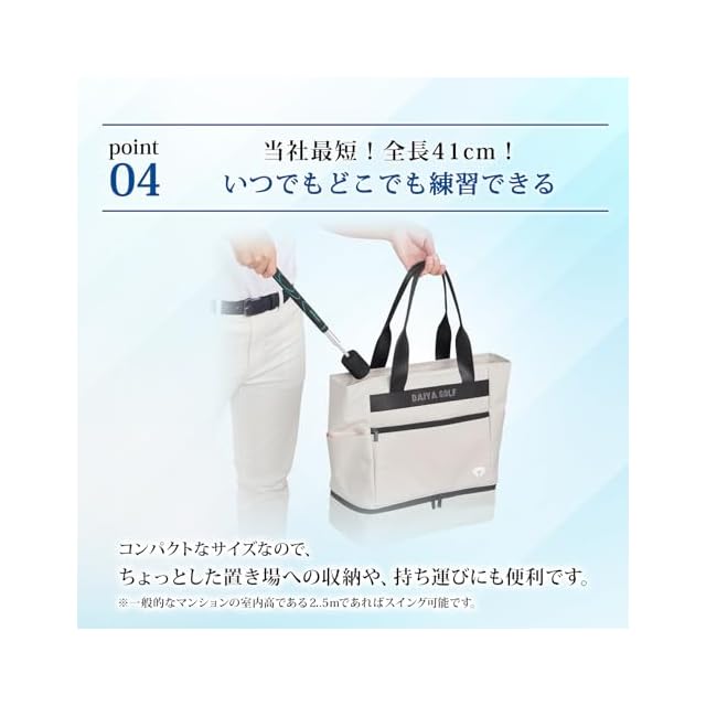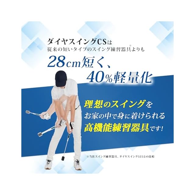 ダイヤスイングシリーズで最短、最軽量モデル。室内での素振りや、外出先への持ち運びもできるのでいつでも気になった時に使用できます。片手でのスイング練習にも最適です。