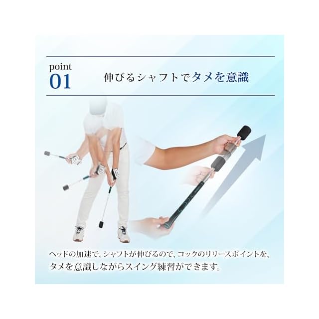 ヘッドの加速でシャフトが伸びるので、コックのリリースポイントをタメを意識しながらスイング練習ができます。