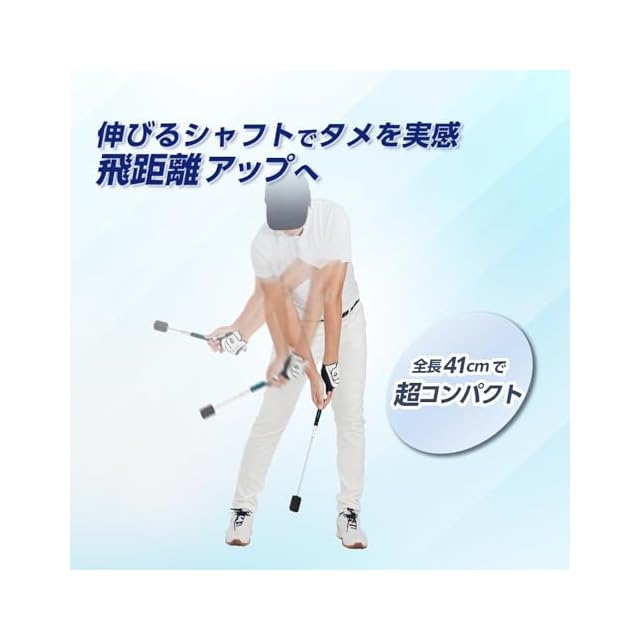 スイングの加速でシャフトが伸びることで、正しいインパクトゾーンを体感できる約41cmのコンパクトなスイング練習器です。