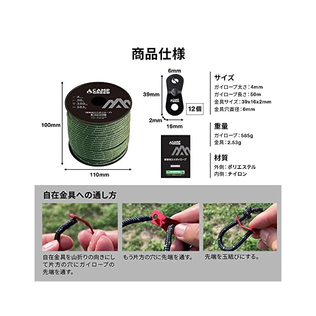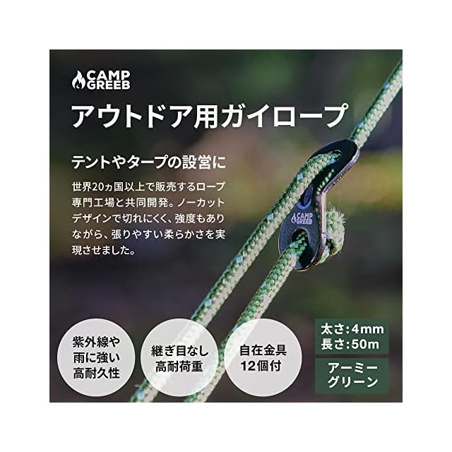 キャンプグリーブ 反射材入りパラコード 3mm/4mm/5mm ガイロープ 30m/50m巻 耐荷重240kg/350kg/420kg 自在金具12個付 継ぎ目なしノーカット テントロープ キャンプ (30, アーミーグリーン/4mm)