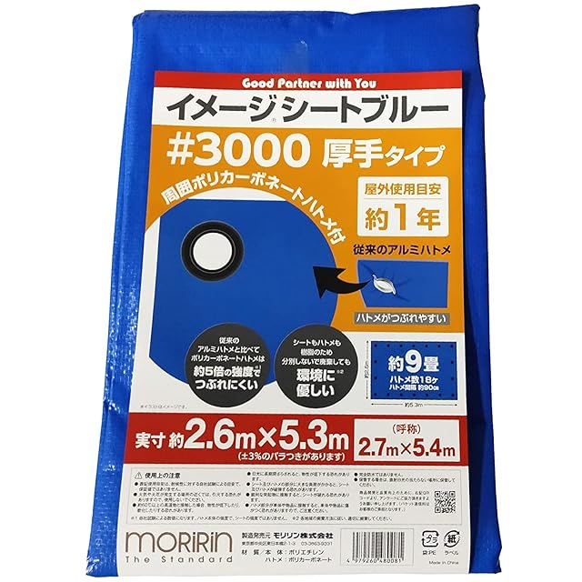 [仕様]#3000厚手、材質:ポリエチレン(本体)、ポリカーボネート(ハトメ)、ハトメ数18ヵ所、ハトメ間隔約90㎝