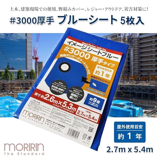 商品名:モリリン ブルーシート レジャーシート 5枚セット イメージシートブルー #3000 厚手 2.7×5.4m ポリカーボネートハトメ 使用目安約1年