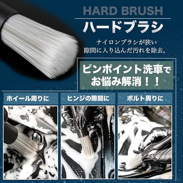 【商品名】洗車ブラシ5本セット 【使いやすい5種類セット】ディテールブラシは硬さの異なる3本セットで様々なシーンでお使いいただけます。車内の掃除だけでなく、車体、ホイール、掃除が難しい隙間の掃除にも使用できます。 【ソフト】: 柔らかいブラシを使用すると、傷を効果的に防ぐことができます。 【ミディアム】: 豚毛ブラシ。主に車のロゴ、車のグリル、ヘッドライトの隙間、車体の隙間などのやや硬い部分の清掃に使用されます。 【ハード】: ハードの洗車ブラシで狭い隙間や強固な汚れに最適なブラシ。強力な洗浄力で、ホイールハブ、エンジンギャップなどの汚れたディテールを洗浄できます。ハードの洗車ブラシは、車の内部を掃除しないように推奨します。 【マイクロブラシ】:車のエンブレム、レター、ヘッドライトの隙間、車体の隙間など汚れをピンポイントで除去できます。 【ホイールブラシ】ホイール周りの汚れに対応!手の届きにくい裏の汚れをごっそり洗浄