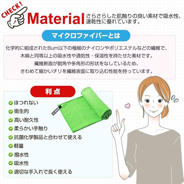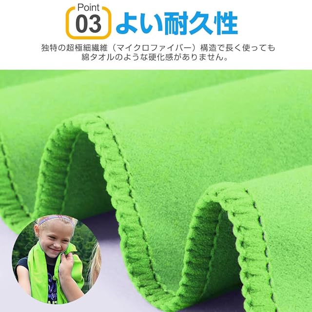 【超吸水・速乾・抗菌】見た目が薄くても吸水性に優れ、タオル専用のふわふわなマイクロファイバー繊維を使った吸水速乾タオル。極細繊維で肌触りもシルキーです。抜群の吸収力のうえ、軽くて肌触りも良く、耐久性も優れています。カビを防ぎ抗菌処理を施しました、汗を吸っても安心、濡らしたタオルに雑菌が繁殖するのも防いでくれます。