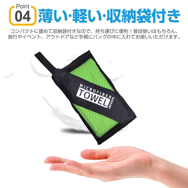 【コンパクトで軽量】薄い生地なので、折り畳み易く、簡単に収納袋に収まる。折り畳み時は、薄さは普通の綿タオルの1/4コンパクトなタオル。速乾タオルサイズ:40cm×80cm 付属品:収納袋