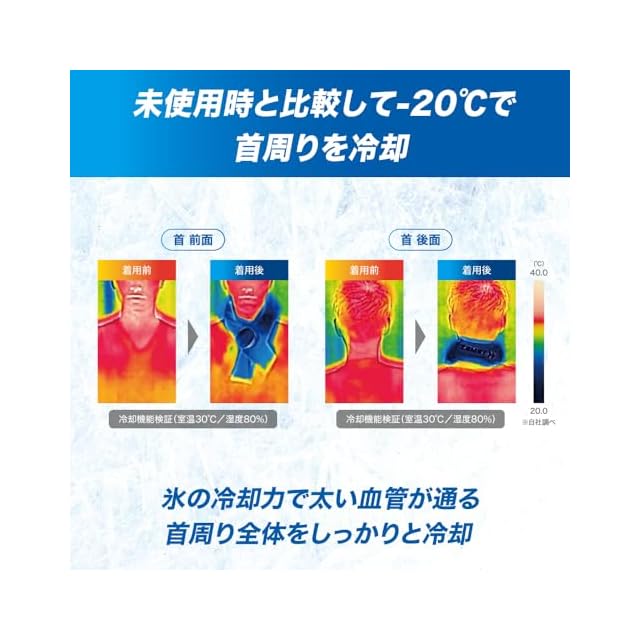 【未使用時と比較して-20℃で首回りを冷やす】氷の冷却力で太い血管が通る首回り全体を広範囲に冷やします。