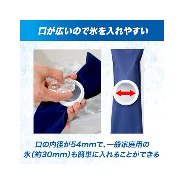 【ハンズフリーなので快適に冷却】水分補給や休息時でも手を使わずにクーリングが可能。また、口の内径が54mmで、一般家庭の氷(約30mm)も簡単に入れることができます。
