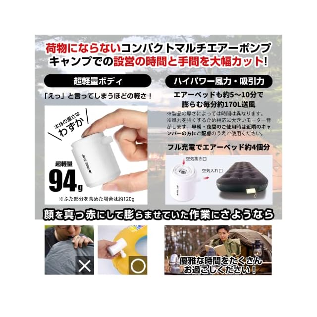 【超軽量&強力電動エアーポンプ】超軽量モデルの電動エアーポンプ。本体重量は約94g(フタ含む120g)。コンパクトだけど風密度170L/分と強力で、インフレーターマットなどの空気入れ/空気抜きをしっかりサポートします。 キャンプ、アウトドアでこれがあれば準備が楽ちんです。