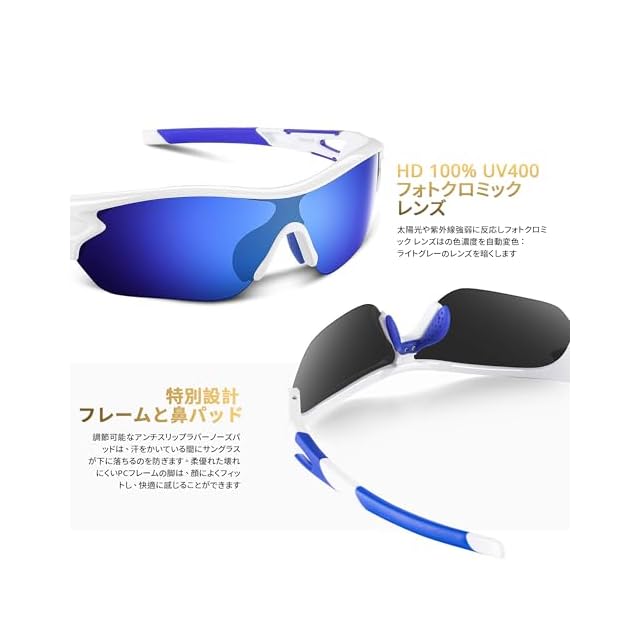 柔らかいフレーム素材: 軽量なTR90リムレスジャケットフレームの設計は剃りにくく、耐衝撃性、耐傷性、耐久性に優れた壊れにくいです。汗をかいたときにサングラスが落ちるのを防ぎ、顔にしっかりとフィットする柔軟滑り止めゴム鼻パッド。サングラス 夜間運転用は高品質で超軽量、強度、柔軟性、安定性が高く、高速スポーツ時にクリアな視界を提供しており、日本人のために設計されています