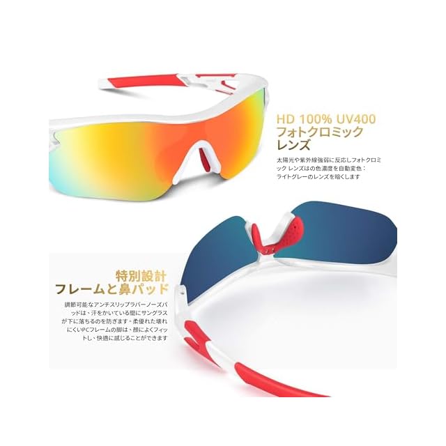 柔らかいフレーム素材: 軽量なTR90リムレスジャケットフレームの設計は剃りにくく、耐衝撃性、耐傷性、耐久性に優れた壊れにくいです。汗をかいたときにサングラスが落ちるのを防ぎ、顔にしっかりとフィットする柔軟滑り止めゴム鼻パッド。サングラス 夜間運転用は高品質で超軽量、強度、柔軟性、安定性が高く、高速スポーツ時にクリアな視界を提供しており、日本人のために設計されています