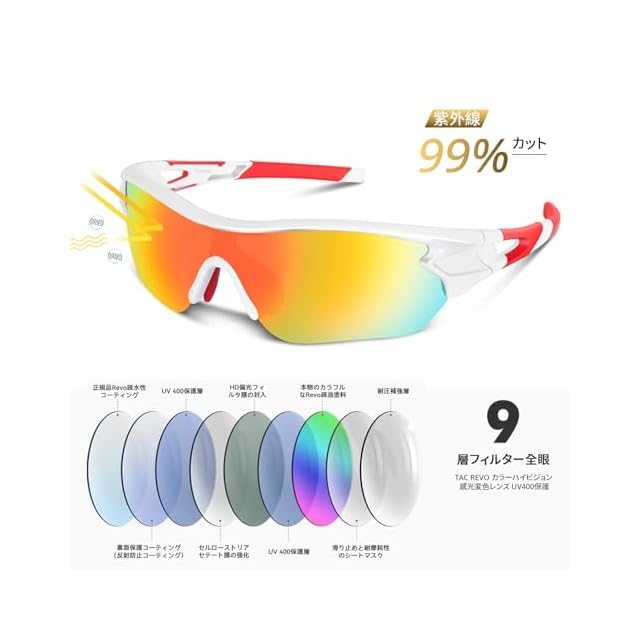 高品質のREVOカラーハイビジョン偏光レンズ:すべての偏光レンズは高品質破砕防止TAC材料で作られており、UV 400レンズ保護コーティング、有害なUVAとUVB 99.9%をブロックし、本物の色を復元し、REVO偏光レンズを使用して元の色を維持し、効果的に視覚の透明度とコントラストを改善し、より簡単に反射や散乱光を排除します。偏光サングラスは風景をよりクリアで柔らかくし、目の負担を減らします