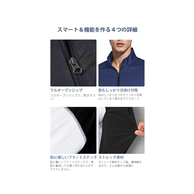 【着脱しやすい】メンズ 用ラッシュガードは脱ぎ着がカンタンな前開きフルジップタイプで、しっかり衿が立つのでうっかり日焼けしてしまう首元までUVガード。タウンでもビーチでも邪魔にならないので便利です。