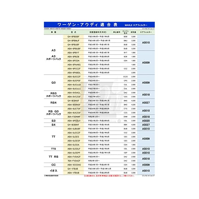 適合車種【A3 スポーツバック3.2クワトロ Sライン 3.2クワトロ 型式 ABA-8PBUBF GH-8PBDBF GH-8PBMJF GH-8PBUBF】【RS Q3 型式 ABA-8UCTSF ABA-8UCZGF】【TT 3.2クワトロ 型式 ABA-8JBUBF】【TTS クーペ 型式 ABA-8JCDLF】【TT RSクーペ プラスクーペ 型式 ABA-8JCEPF】