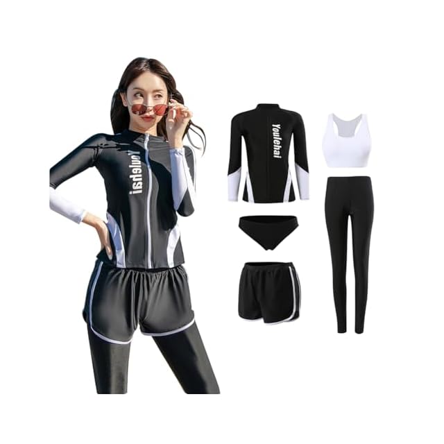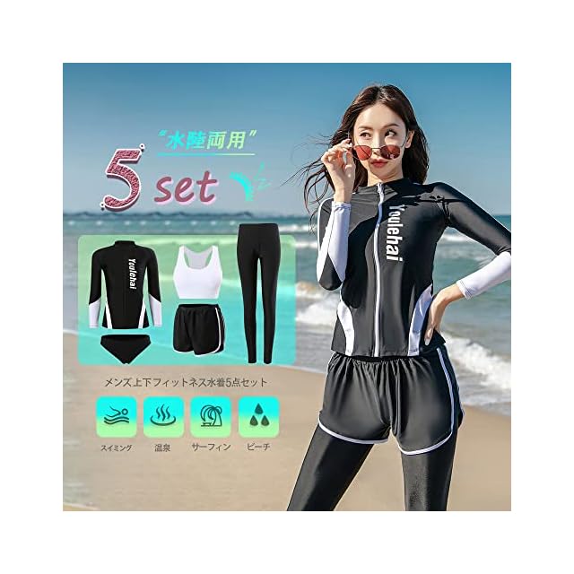 [YFMAYI] 水着 レディース ラッシュガード セット 長袖 前開き セパレート スイミング パンツ ブラ フィットネス お洒落 水陸両用 5点セット