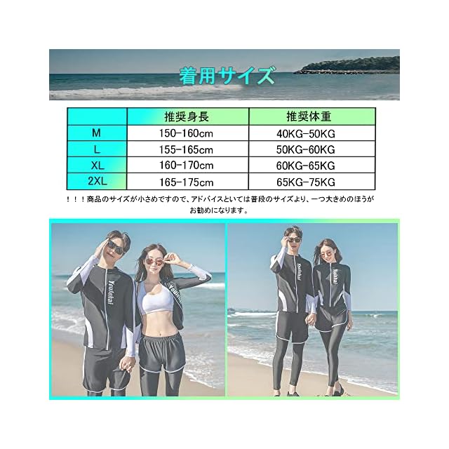 !!!商品のサイズが小さめですので、アドバイスといては普段のサイズより、一つ大きめのほうがお勧めになります。【セット内容&着用サイズ】長袖ラッシュガード、ショートパンツ、ブラ、レギンス、ビギニショーツがセットになっています。必要なものがセットになっているので、届いてすぐに海に行くことができます。長袖ラッシュガードとレギンスセット、レギンス付き足首まであるので、虫刺されやクラゲ対策、擦り傷などの外傷対策にも。【着用サイズ】【M: 推奨身長150-160cm/推奨体重:40KG-50KG】【L:推奨身長155-165cm/推奨体重:50KG-60KG】【XL:推奨身長160-170cm/推奨体重:60KG-65KG】【2XL:推奨身長165-175cm/推奨体重:65KG-75KG】※サイズを選択する時サイズ表を参照してください。